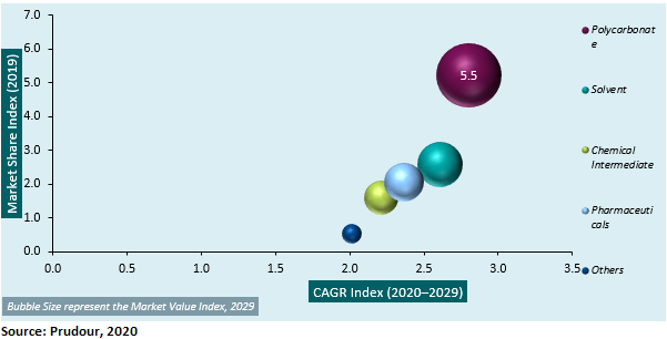 In terms of application, the polycarbonate segment accounted for the majority revenue shares of the global dimethyl carbonate market in 2019, and is projected to register the highest CAGR, with an attractiveness index of 5.5, over the forecast period. The solvent segment accounted for a considerable number of revenue shares in 2019, and is expected to continue to do so in the coming years.